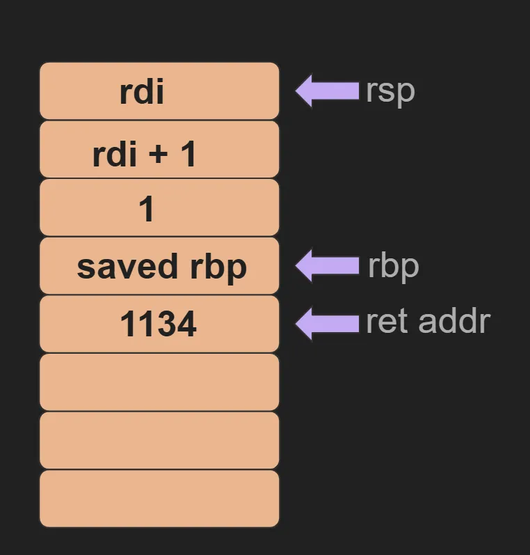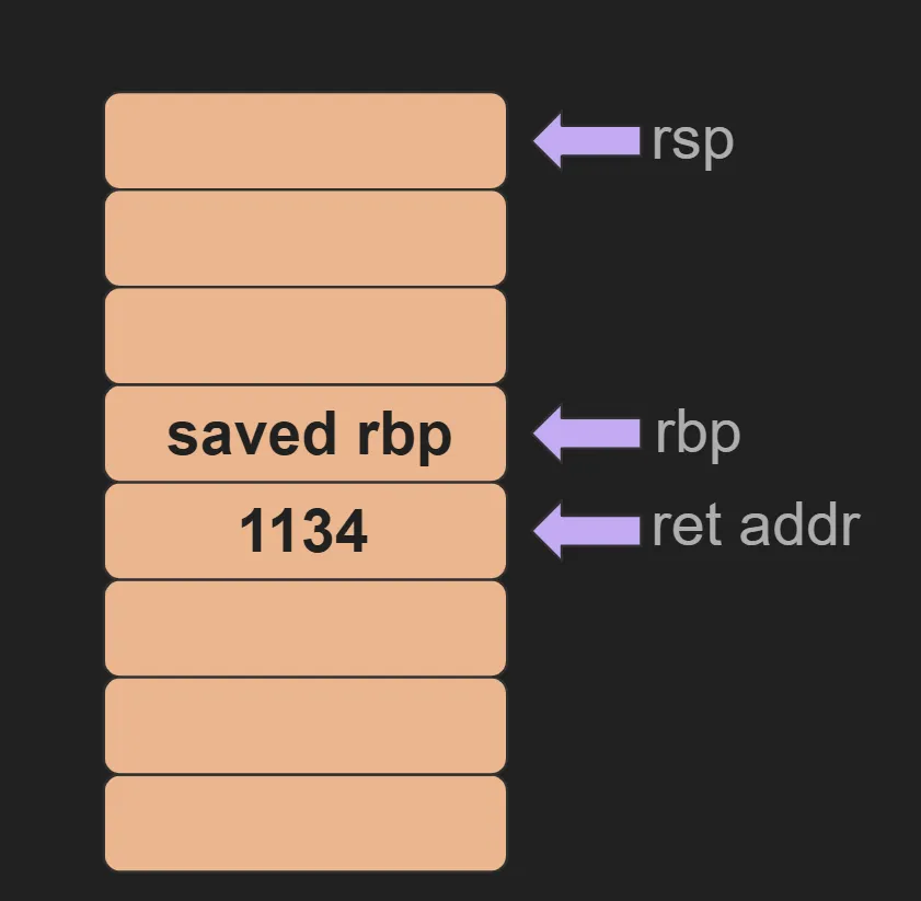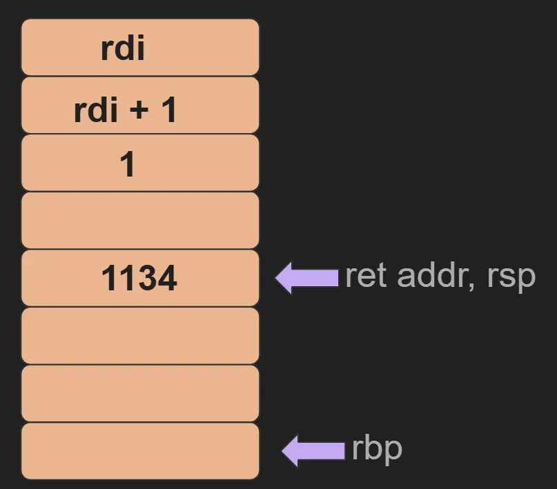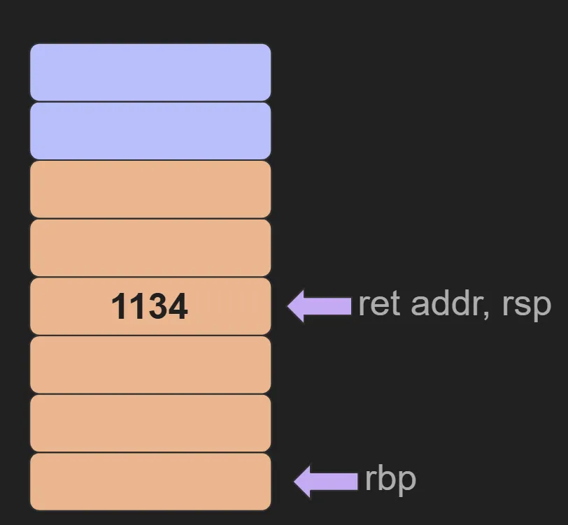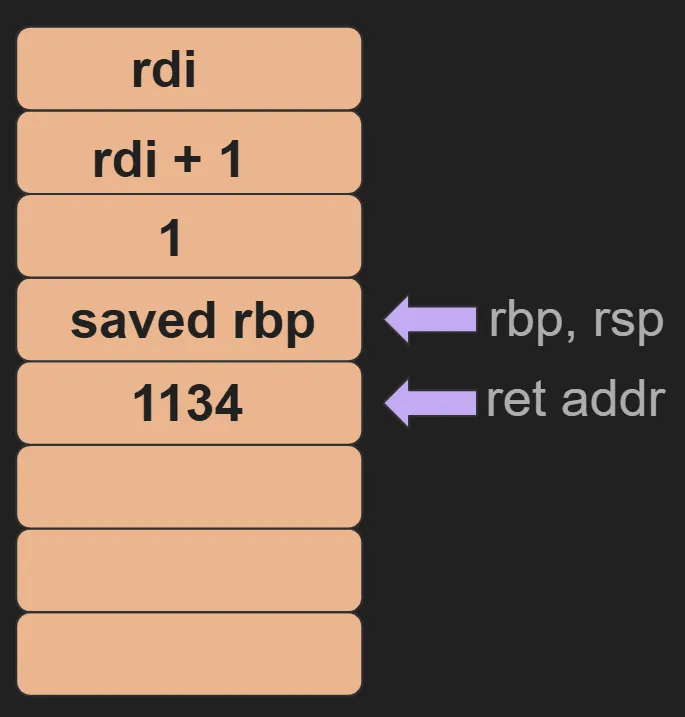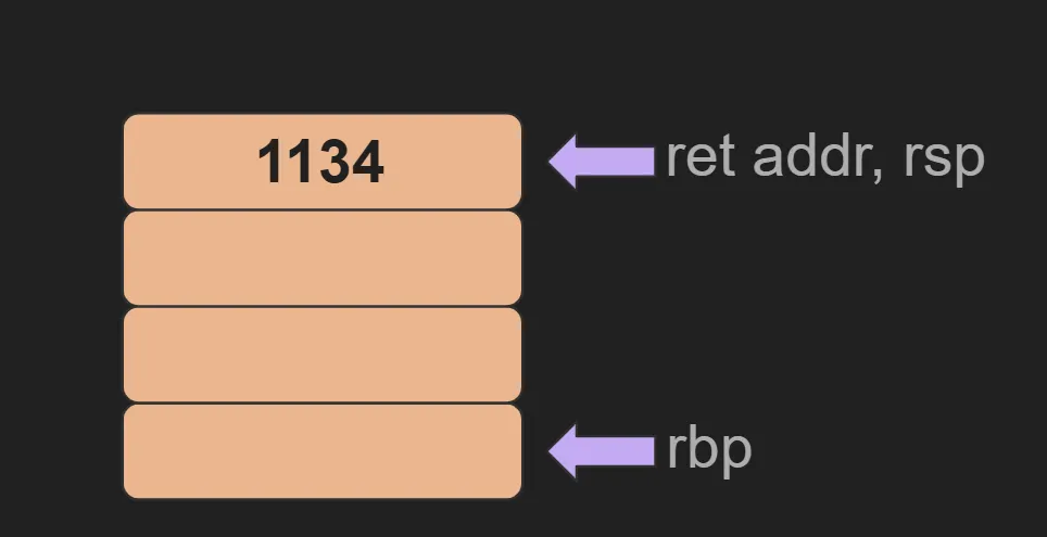 000000000000113c <_fini>: 113c: f3 0f 1e fa endbr64 1140: 48 83 ec 08 sub rsp,0x8 1144: 48 83 c4 08 add rsp,0x8 1148: c3 retThe call function does 2 things, first it pushes the address of the instruction after it to the stack, then it jumps to the address of the function it is calling. So in this case it will push 1134 to the stack, then jumps to inc. The address 1134 is called the return address because that is where the program will jump to after the inc function has finished executing. Visually, here is what the stack looks like after the call function