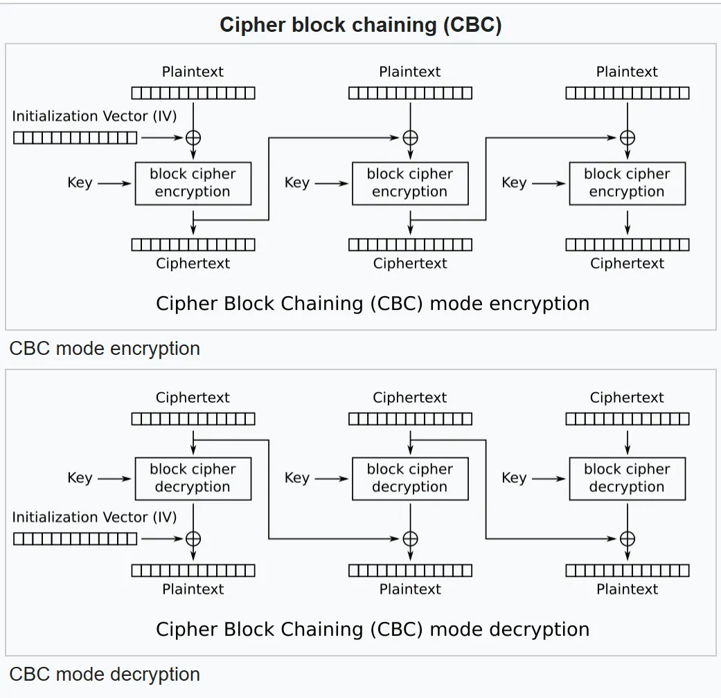 if __name__ == '__main__': main()Here, there are 2 important things to notice, first is that the key is reused and second is that we are “encrypting” our plaintext by decrypting it. To solve this challenge, we need to understand how AES CBC encryption and decryption works.