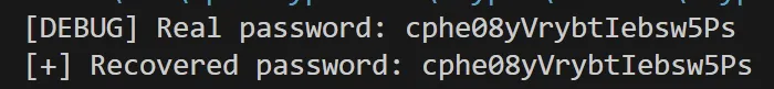 for i in range(20): padding_length = 31 - i payload = "A" * padding_length reference_ciphertext = encrypt_creds(payload) password_block = reference_ciphertext[16:32] for char in charset: test_payload = "A" * padding_length + known_password + char test_ciphertext = encrypt_creds(test_payload) test_block = test_ciphertext[16:32] if test_block == password_block: known_password += char breakprint(f"[+] Recovered password: {known_password}")
