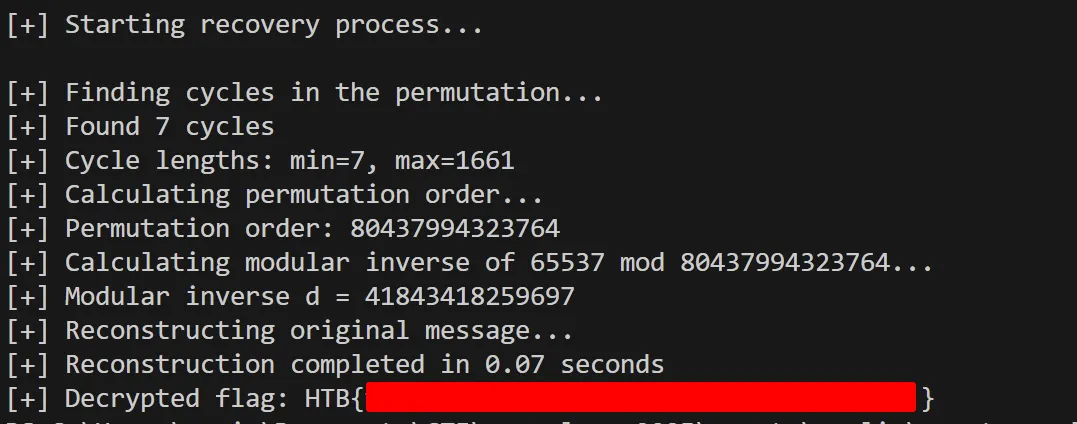 def main(): # Prime n value as mentioned n = 0x1337 # 4919 e = 0x10001 # 65537 scrambled_message = [] enc_flag = 'ca9d6ab65e39b17004d1d4cc49c8d6e82f9fa7419824d07096d41ee41f0578fe6835da78bc31dd46587a86377883e0b7' enc_flag_bytes = bytes.fromhex(enc_flag) print("\n[+] Starting recovery process...\n")