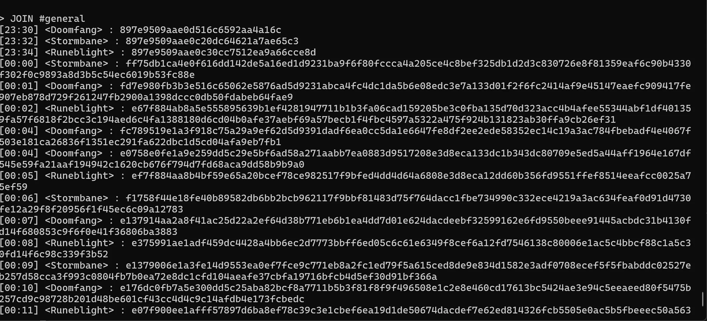 Decrypted text: !nick DoomfangDecrypted text: !nick StormbaneDecrypted text: !nick RuneblightDecrypted text: We've got a newDecrypted text: Understood. HasDecrypted text: Not yet, but I'mDecrypted text: This channel isDecrypted text: Here is the passDecrypted text: Got it. Only shaDecrypted text: Yes. Our last moDecrypted text: I'm checking ourDecrypted text: Keep me updated.Decrypted text: I'll compare theDecrypted text: If everything isDecrypted text: Hold on. I'm seeDecrypted text: We can't take anDecrypted text: Agreed. Move allDecrypted text: Understood. I'mDecrypted text: !leaveDecrypted text: !leaveDecrypted text: !leaveNow we need to do a process called crib dragging, where we deduce what is the next word/letter from the context. Let’s take this line for example: Here is the pass. We can deduce that it should be Here is the passphrase so we input that as our new known plaintext and replace with the corresponding ciphertext and we get this output: